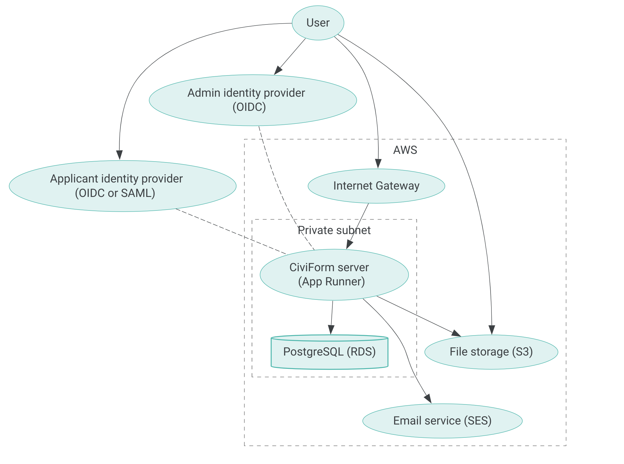 The CiviForm system is comprised of a set of resources (e.g. application servers, PostgreSQL database, file storage) will be running in a virtual private cloud (VPC).